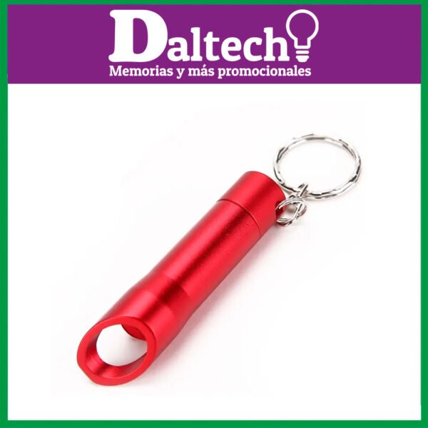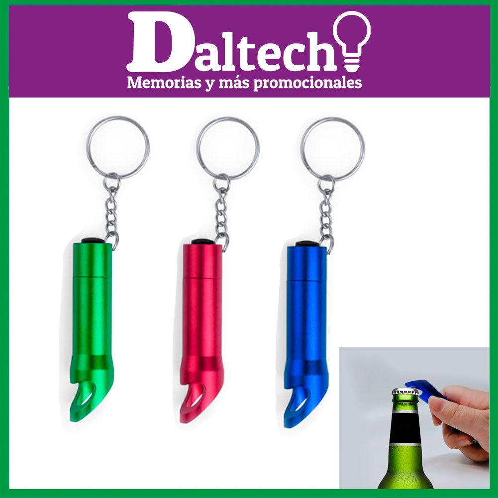 Linterna llavero de 3 ledes de alto poder de iluminación y abrebotellas integrado. Con resistente cuerpo en aluminio de variados y vivos colores brillantes y pulsador protegido con recubrimiento de resistente goma.